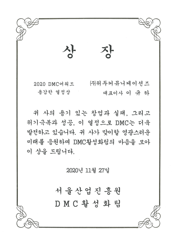 2020 서울산업진흥원 2020 DMC어워드 페이지 정보 작성자 WeDu 댓글 0건 조회 4,491회 작성일 21-12-31 12:57 본문 2020-11-27 2020 DMC어워드 용감한 열정상 서울산업진흥원 DMC활성화팀 List Previous2020 기술혁신 우수기업 21.12.31 Next2018 소년한국 우수 어린이 도서 19.05.30