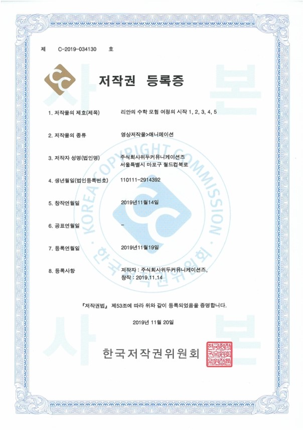 [한국/저작권] 리안의 수학 모험 여정의 시작 1,2,3,4,5 페이지 정보 작성자 WeDu 댓글 0건 조회 4,708회 작성일 21-12-31 12:36 본문 2019-11-20 저작권 C-2019-034130 영상저작물>애니메이션 List Previous[한국/저작권] OLL KIDS/MATH 21.12.31 Next[한국/저작권] 리안의 수학 모험 애니메이션 OST 19.11.25