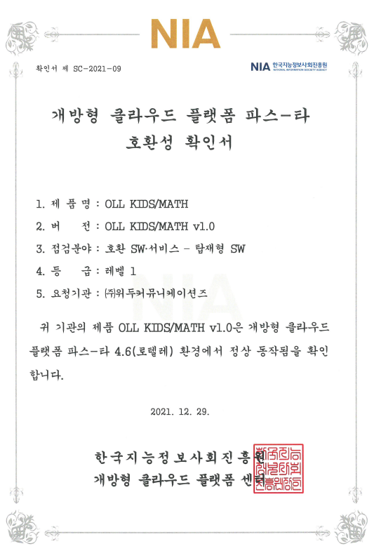 [한국/확인서] OLL KIDS/MATH 파스-타 호환성 확인서 페이지 정보 작성자 WeDu 댓글 0건 조회 8,220회 작성일 21-12-31 12:48 본문 2021-12-29 확인서 제 SC-2021-09 점검분야 : 호환 SW서비스 - 탑재형 SW List Next[한국/인증서] OLL KIDS/MATH 클라우드 서비스 확인서 21.12.31